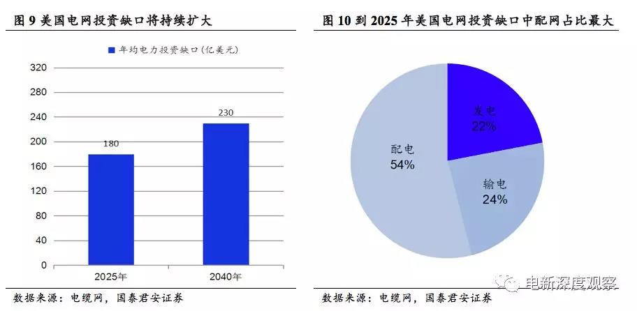 美國存在較大電網(wǎng)投資缺口,其中配網(wǎng)部分最顯著。據(jù)美國土木工程師協(xié)會(huì)于2016年發(fā)布的美國基礎(chǔ)設(shè)施投資缺口研究報(bào)告,美國電網(wǎng)投資缺口持續(xù)擴(kuò)大將嚴(yán)重?fù)p害經(jīng)濟(jì)社會(huì)的發(fā)展。到2025年,投資缺口額將累計(jì)達(dá)到1770億美元,到2040年,則將進(jìn)一步超過5650億美元。若這一情況繼續(xù)得不到解決,將給美國經(jīng)濟(jì)發(fā)展成本造成很大負(fù)擔(dān),同時(shí)促使美國家庭生活成本和企業(yè)經(jīng)營成本的上升,最終導(dǎo)致全國GDP的下滑。據(jù)該報(bào)告推算,到2025年,美國GDP將減少8190億美元,失業(yè)人口增加10.2萬,到2040年,GDP將擴(kuò)大減幅至1.9萬億美元,失業(yè)人口升至24.2萬。
