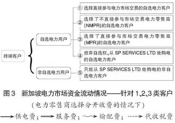 根據(jù)客戶的選擇不同,可將新加坡電力市場終端客戶分為如下5類,即選擇直接參與電力市場交易的自選電力客戶、選擇不直接參與市場交易電力零售商(NMPR)的自選電力客戶、選擇直接參與市場交易電力零售商的自選電力客戶、放棄自選權(quán)從SPServicesLtd處購電的自選電力客戶和只能從SPServicesLtd處購電的非自選電力用戶(見圖2)。