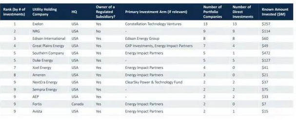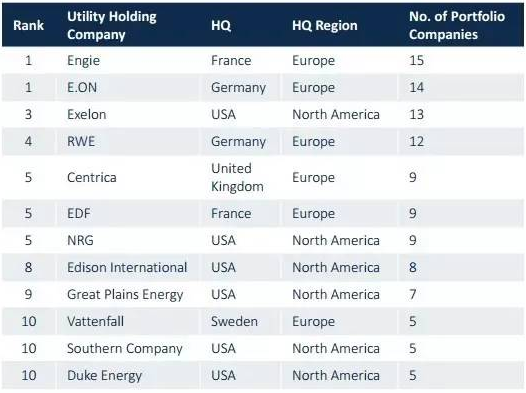 下表羅列了排名前十的投資分布式能源企業(yè)的歐美地區(qū)集團(tuán)。投資的企業(yè)包括光伏公司、其他分布式能源公司、儲(chǔ)能公司、提供能源管理方案的公司、分布式能源系統(tǒng)集成公司等。