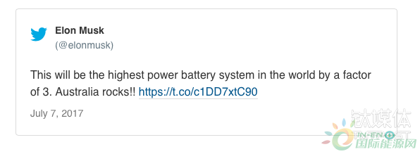 特斯拉創(chuàng)始人兼首席執(zhí)行官馬斯克對這筆交易感到興奮。在個人推特上,他自豪地宣布,Hornsdale Powerpack系統(tǒng)將成為世界上最高功率的電池儲能系統(tǒng)。