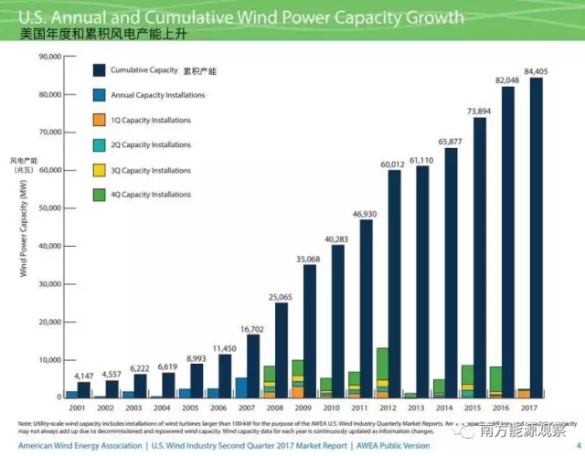 這一容量來(lái)自于安裝在美國(guó)50個(gè)州,哥倫比亞特區(qū),關(guān)島,波多黎各和美屬維爾京群島的大約77,000渦輪機(jī)。