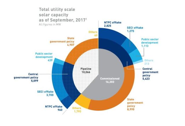 印度公用事業(yè)規(guī)模太陽能總?cè)萘吭?017年9月達到16.2吉瓦。這一增長表現(xiàn)在過去四個季度中的84%的裝機總量達到了7.5GW。另外,根據(jù)印度“印度”印度太陽能地圖2017年9月版,據(jù)開發(fā)商分配了10吉瓦的太陽能容量。