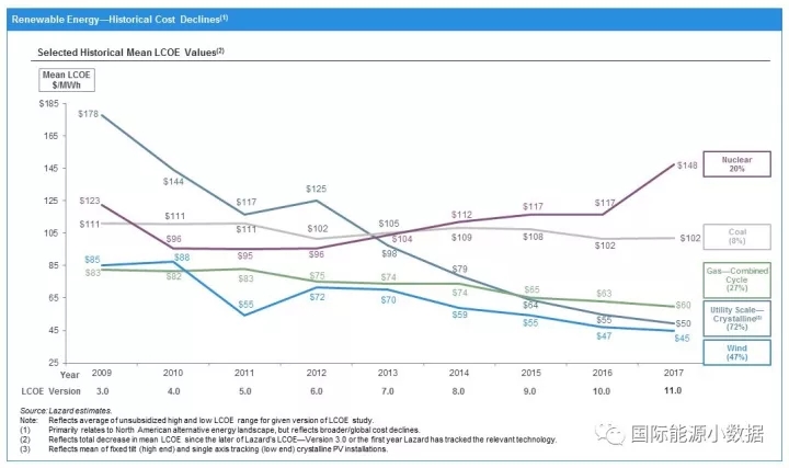 美國(guó)LAZARD公司日前發(fā)布一年一度的美國(guó)各類發(fā)電技術(shù)平準(zhǔn)成本(Lazard Levelized Cost of Energy Version 11.0)數(shù)據(jù)。