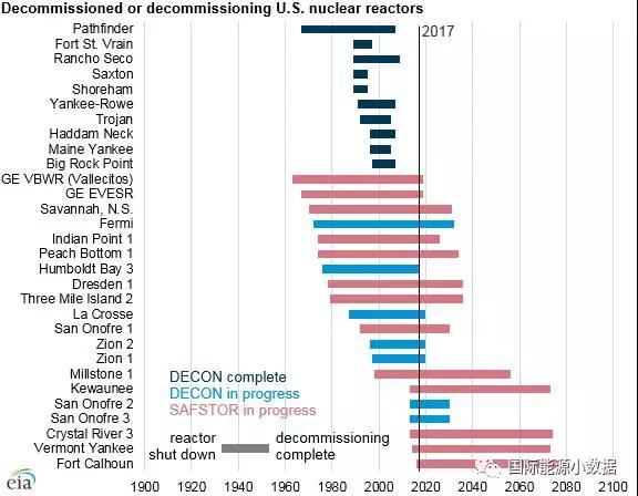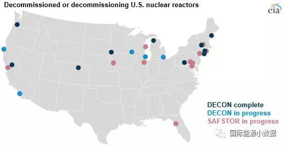 根據(jù)美國能源信息署發(fā)布的信息,美國已經(jīng)有10座核反應(yīng)堆成功完成了全部退役過程,目前還有20座反應(yīng)堆正在退役過程中。