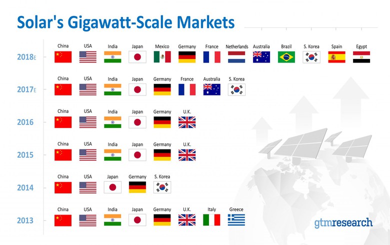 根據(jù)市場調(diào)研機(jī)構(gòu)GTM Research,2018年巴西、埃及、墨西哥、荷蘭和西班牙將加入吉瓦級規(guī)模太陽能市場。