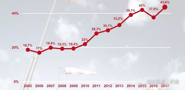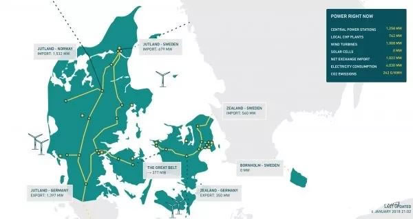 根據(jù)Energinet.dk提供的數(shù)據(jù),2017年底丹麥風(fēng)電裝機(jī)達(dá)到5.3吉瓦,全年發(fā)電量14.7TWh(147億千瓦時(shí)),占全國發(fā)電總量的43.6%,創(chuàng)歷史新高;預(yù)計(jì)2020年丹麥風(fēng)電占比將超過50%。