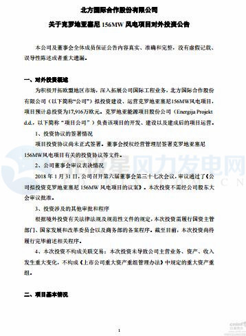 總投資1.79億歐元 北方國際擬投建克羅地亞塞尼156MW風(fēng)電項(xiàng)目