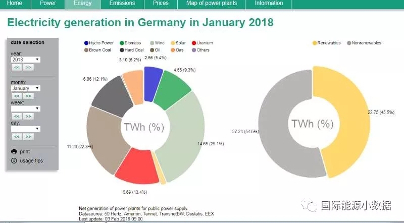 根據(jù)Energy-Charts的綜合統(tǒng)計(jì),2018年1月份德國(guó)發(fā)電量(不計(jì)分布式)為49.99TWh(499.9億千瓦時(shí)),其中褐煤11.20TWh(22.3%)、硬煤6.06TWh(12.1%)、風(fēng)電14.65TWh(29.1%)、核電6.69TWh(13.4%)、生物質(zhì)發(fā)電4.65TWh(9.3%)、天然氣發(fā)電3.10TWh(6.2%)、太陽能發(fā)電0.79TWh(2.0%)。綜合來看,可再生能源發(fā)電量達(dá)到22.75TWh,占總發(fā)電量的45.5%。