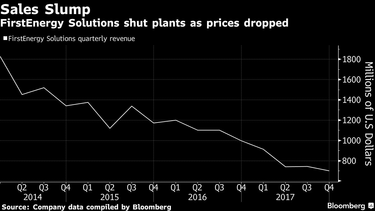 由于需求停滯,廉價(jià)天然氣和風(fēng)能和太陽能的澎湃發(fā)展擠壓了利潤(rùn),美國各地的發(fā)電廠一直受到低電價(jià)的沖擊。FirstEnergy Solutions公司在俄亥俄州和賓夕法尼亞州擁有一批煤炭和核電站。
