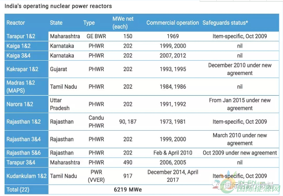印度目前共有22個核電機(jī)組,總裝機(jī)容量為6,780兆瓦,發(fā)電量占全國總發(fā)電量的3 38%。目前有6座核電機(jī)組在建,預(yù)計(jì)到2022年增加6,000兆瓦的核