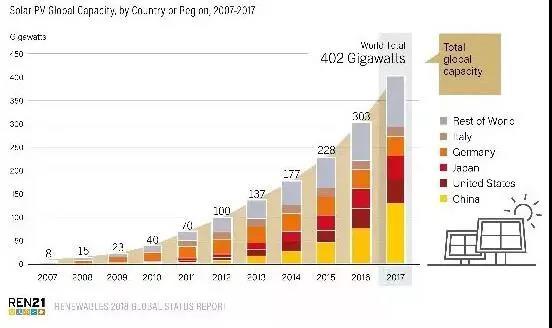 太陽(yáng)能光伏新增裝機(jī)容量達(dá)到創(chuàng)紀(jì)錄的水平:與2016年相比,太陽(yáng)能光伏發(fā)電裝機(jī)總量增加了29%,達(dá)到98GW。光伏新增裝機(jī)容量大于燃煤、天然氣和核電凈增裝機(jī)容量之和。此外,全球風(fēng)電新增裝機(jī)容量52GW,也對(duì)可再生能源總裝機(jī)容量起到了擴(kuò)充作用。