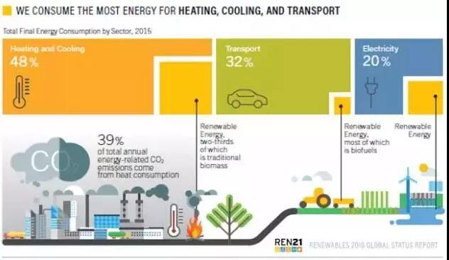 根據(jù)REN21的2018年“全球可再生能源現(xiàn)狀報(bào)告”(GSR),2017年可再生能源發(fā)電占到全球發(fā)電量?jī)粼黾又档?0%。這是現(xiàn)代歷史上可再生能源發(fā)電量增長(zhǎng)最大的一年。然而占全球終端能源需求量80%的供熱、制冷和交通領(lǐng)域?qū)τ诳稍偕茉吹氖褂脜s遠(yuǎn)遠(yuǎn)落后于電力行業(yè)。