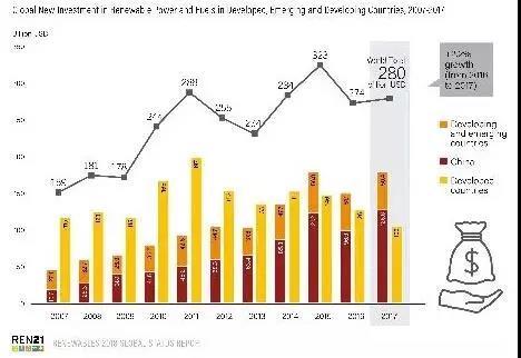 可再生能源的投資區(qū)域性集中:2017年,中國(guó)、歐洲和美國(guó)對(duì)可再生能源的投資占全球可再生能源投資總額的近75%。然而,當(dāng)測(cè)量單位國(guó)內(nèi)生產(chǎn)總值(GDP)時(shí),馬紹爾群島、盧旺達(dá)、所羅門群島、幾內(nèi)亞比紹和許多其他發(fā)展中國(guó)家對(duì)可再生能源的投資比例卻遠(yuǎn)高于發(fā)達(dá)國(guó)家和新興經(jīng)濟(jì)體。