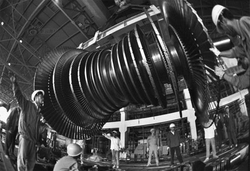 《鍋爐水冷壁吊裝》1989年,山東電建三公司承建的我國第一座集資發(fā)電廠——龍口發(fā)電廠二期20萬千瓦發(fā)電機組,工人正在指揮鍋爐水冷壁安裝。