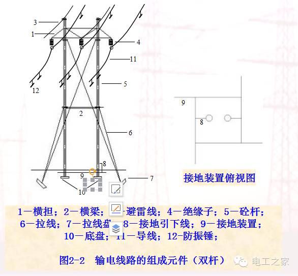 架空線路主要由(1)導(dǎo)線、(2)避雷線(即架空地線)、(3)絕緣子、(4)金具、(5)桿塔、(6)基礎(chǔ)、(7)接地裝置等部件組成,如圖所示。