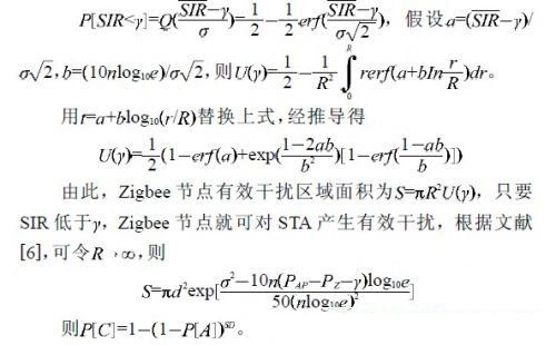 根據(jù)文獻(xiàn)[5]和[6],對(duì)于一個(gè)半徑為R 的覆蓋區(qū),假設(shè)STA的SIR 的閾值為γ (如果Zigbee 節(jié)點(diǎn)要對(duì)STA 產(chǎn)生有效的干擾,使其SIR 必須小于γ ),則有效干擾區(qū)域的百分比為U(γ )(即對(duì)于STA的SIR低于γ的區(qū)域百分比),如果在半徑范圍內(nèi)導(dǎo)致SIR低于閾值的概率為P[SIR《γ] ,則: