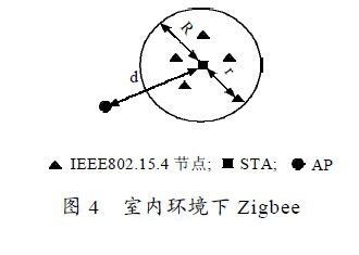 本節(jié)將分析在頻偏為零的同信道條件下Zigbee 對(duì)Wi-Fi的干擾。假設(shè)一室內(nèi)環(huán)境下的Zigbee 和Wi-Fi 設(shè)備節(jié)點(diǎn)如圖4 分布。每個(gè)Zigbee 節(jié)點(diǎn)呈獨(dú)立一致性均勻分布,其處于活動(dòng)狀態(tài)的概率為P[A ],分布密度為D.假設(shè)有個(gè)Zigbee 節(jié)點(diǎn)會(huì)產(chǎn)生對(duì)STA 有效的干擾,則分組沖突概率P[C]為m2:本文室內(nèi)路徑損耗選用對(duì)數(shù)距離模型: