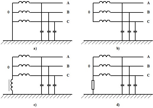 在電力系統(tǒng)中,當(dāng)變壓器或發(fā)電機(jī)的三相繞組為星形聯(lián)結(jié)時(shí),其中性點(diǎn)可有兩種運(yùn)行方式:中性點(diǎn)接地和中性點(diǎn)部接地。中性點(diǎn)直接接地系統(tǒng)稱為大電流接地系統(tǒng),中性點(diǎn)不接地和中性點(diǎn)經(jīng)消弧線圈(或電阻)接地的系統(tǒng)稱為小電流接地系統(tǒng)。中性點(diǎn)的運(yùn)行方式主要取決于單相接地時(shí)電氣設(shè)備絕緣要求及供電可靠性。圖1-2列出了常用的中性點(diǎn)運(yùn)行方式。圖中,電容C為輸電線路對(duì)地分布電容。