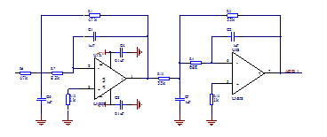 由于此電路由兩個(gè)相同二階電路組成,因此只需分析一個(gè)即可。對(duì)第一個(gè)二階電路:當(dāng)頻率f=0時(shí),C1和C6均開路,通帶放大倍數(shù)