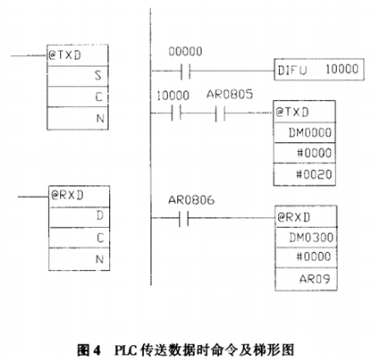 通訊中的上位計(jì)算機(jī)和PLC,PLC具有發(fā)生命令、啟動(dòng)通訊、優(yōu)先權(quán)給計(jì)算機(jī)接受發(fā)過來的命令。上位計(jì)算機(jī)和PLC在通訊時(shí),設(shè)定傳輸延遲時(shí)間和通訊參數(shù)一定要首先執(zhí)行。停止位、波特率、數(shù)據(jù)長度、奇偶校驗(yàn)、起始位是在數(shù)據(jù)參數(shù)包括中的。PLC具備優(yōu)先權(quán),改變數(shù)據(jù)時(shí),CQML是能夠自動(dòng)數(shù)據(jù)傳輸?shù)?,?jì)算機(jī)長時(shí)間的監(jiān)視需要可以減少,簡單化的處理通訊。P L C傳輸以及接收數(shù)據(jù)命令,分別為R X D (-) T X D (-) .圖4中的命令TXD、BXD的梯形圖格。S是為傳輸數(shù)據(jù)的開始字,存儲(chǔ)以及接受數(shù)據(jù)的首地址為D,控制數(shù)據(jù)為C,它的00-03中0或1是表示最左邊的字節(jié)還是最右邊的字節(jié)表示起始字節(jié),12-15中0和1則是端口為外設(shè)端口還是R232C,傳輸數(shù)據(jù)字節(jié)則用N來表示,BCD碼由4個(gè)組成表示,PLC在傳輸數(shù)據(jù)中,要查看AR0805的標(biāo)志傳輸?shù)臏?zhǔn)備,才可以傳輸數(shù)據(jù),它為ON。確認(rèn)標(biāo)志為AR0806當(dāng)PLV在接受數(shù)據(jù)時(shí),ON方可接受數(shù)據(jù)。圖4中RS-232C為PLC所使用的端口、以RS-232C的模式將( D M 0 0 0 0 - D M 0 0 0 9)的20字節(jié)數(shù)據(jù)傳送到計(jì)算機(jī)并且存儲(chǔ)在從計(jì)算機(jī)中接收的D M O 3 0 0開始中D M區(qū)例子的梯形圖。PLC在傳送數(shù)據(jù)時(shí),程序的接受數(shù)據(jù)應(yīng)該在相應(yīng)的計(jì)算機(jī)中。在執(zhí)行程序中,將PLC的設(shè)定為1000端口的RS-2332的模式以及DM6648為2000的無起始碼,為CR或LF的結(jié)束碼。程序執(zhí)行時(shí),為ON的AR0805,當(dāng)IR0000變成ON的時(shí)候,傳送的數(shù)據(jù)為20個(gè)字節(jié),起始字節(jié)為最左邊的。當(dāng)AR0806變成ON的時(shí)候,AR09的字節(jié)數(shù)為AR09所指定的從CQML緩沖接收器中可以讀出并且存儲(chǔ)到DM0300的內(nèi)存中去。