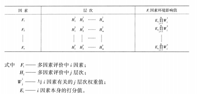 諸因素(用i表示)的環(huán)境影響值是用i因素打分值與相應(yīng)的權(quán)重值相乘而得。而在多因素評價層次結(jié)構(gòu)中,每一種因素將受到本身權(quán)重值的影響,也要受到相應(yīng)的其他層次的權(quán)重值的影響。因而,i因素的環(huán)境影響值的計算可表示如下: