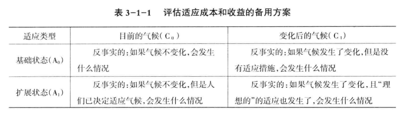 表3-1-1對該方法進行了說明。表中列表示不同的氣候狀態(tài),氣候沒有變化 (C0)和氣候有變化(C1);表中行分別代表不同的適應水平:第二行(A.)為對現有氣候的適應,第三行(A1)為對變化后的氣候的適應。每一格代表其間在四種不同的氣候~適應狀態(tài)下氣候變化影響和適應的方案。