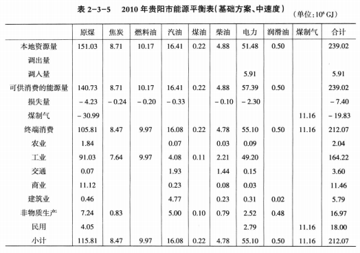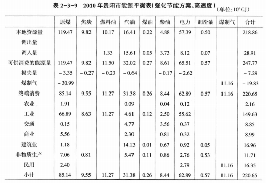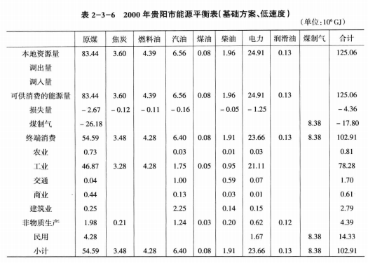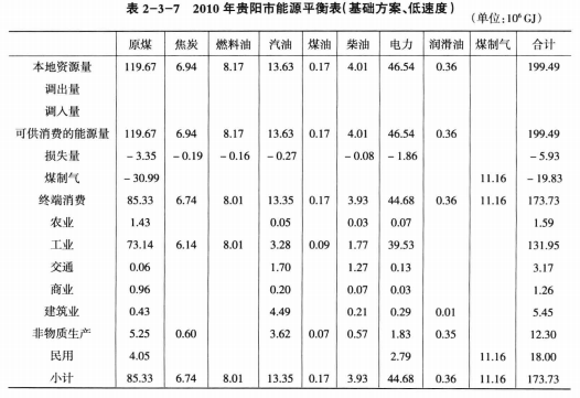 能源轉換子模塊,以前一節(jié)終端能源需求預測數據為基礎,根據上述給定的數據設置,考慮本地資源使用及外地資源的調入,將自動生成不同經濟發(fā)展速度,不同方案下的能源平衡表,請見表2-3-2~表2-3-19貴陽市能源平衡表。