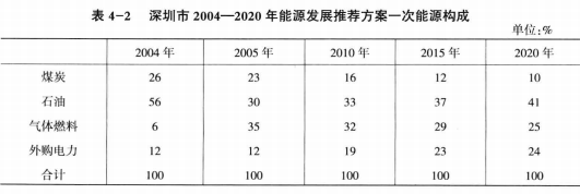 從表4-2可以看出,2004-2020年煤炭在一次能源需求中的構(gòu)成將由26%下降到2020年的10%,下降了16個(gè)百分點(diǎn);石油由56%下降到2020年的41%,下降了15個(gè)百分點(diǎn);氣體燃料由6%上升到2020年的25%,上升了19個(gè)百分點(diǎn);電力由12%上升到2020年的24 %,上升了12個(gè)百分點(diǎn),這樣,深圳市未來的能源結(jié)構(gòu)是一個(gè)優(yōu)化的結(jié)構(gòu)。