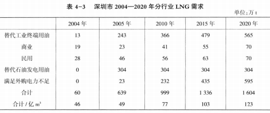 在深圳市2004-2020年能源發(fā)展方案中,LNG在一次能源需求構(gòu)成中由2004年的6%上升到了2020年的25%,在此期間將上升19個(gè)百分點(diǎn),為此,必須加大LNG的發(fā)展步伐。表4-3是我們根據(jù)該方案的基本研究結(jié)果綜合而成的。從表可以看出,LNC在未來的經(jīng)濟(jì)發(fā)展中,將替代工業(yè)部門終端油品使用量、替代石油用于發(fā)電的需求量。除此之外,還要滿足外購電力不足的部分,這部分必須由LNG發(fā)電滿足這樣,LNG需求總量到2005年達(dá)到49億m3、2010年達(dá)到77億m3、2015年達(dá)到103億m3、2020年達(dá)到123億m3,滿足如此大的需求量,對其的發(fā)展必然提出了更高的要求。