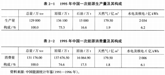1995年,全國一次能源消費(fèi)總量為131 176萬tce,其中原煤占74.6%,原油占17.5%,天然氣占1.8%,水電占6.1%。扣除加工轉(zhuǎn)換損失,1995年全國終端能源消費(fèi)總量為124 253萬tce。1995年全國一次能源生產(chǎn)量及構(gòu)成、1995年一次能源消費(fèi)量及構(gòu)成、1995年全國分品種終端能源消費(fèi)量詳見表2-1、表2-2、表2-3。