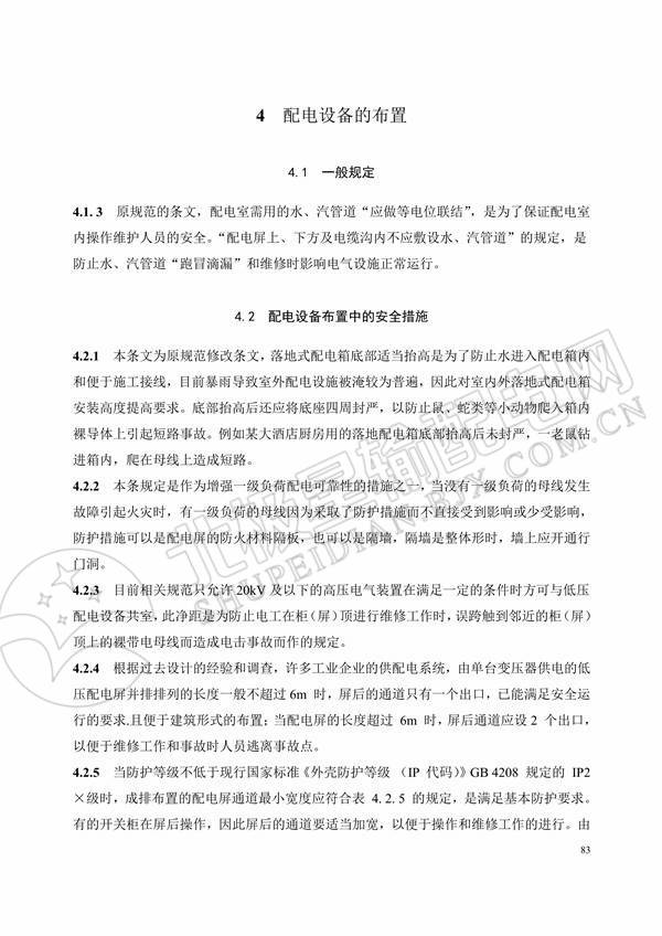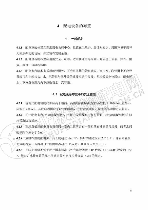 本標準共分六章和2 個附錄,主要技術(shù)內(nèi)容包括:總則、術(shù)語、電器和導(dǎo)體的選擇、配電裝置的布置、安全防護、配電線路的敷設(shè)等。