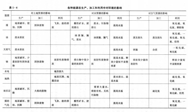 能源對環(huán)境的影響是一種綜合的影響。表1-4給出了各種能源在生產(chǎn)、加工和利用中對環(huán)境的影響。