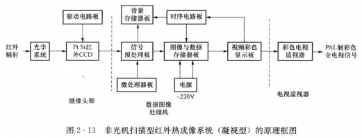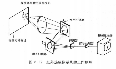 紅外熱成像系統(tǒng)的工作原理如圖2-12所示,光學系統(tǒng)先將現(xiàn)場的紅外輻射能匯集起來,經(jīng)光譜濾波和光機掃描,聚集到探測器的紅外元件的陣列上,探測器將強弱不同的輻射信號變成電信號,然后經(jīng)放大和視頻處理,形成視頻信號,再送至顯示器。