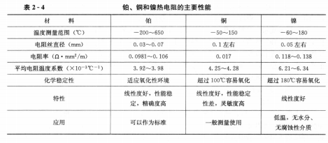 使用較多的金屬熱電阻材料有鉑、銅和鎳,它們的主要性能見表2-4。其中鉑是一種較為理想的熱電阻材料,它的物理化學(xué)性質(zhì)能在高溫和氧化環(huán)境中保持穩(wěn)定,并且在很寬的溫度范圍內(nèi)保持良好的性能特征。銅作為熱電阻材料的優(yōu)點(diǎn)是電阻溫度系數(shù)大、線性度好、易加工、來源廣、價(jià)格使宜;缺點(diǎn)是電阻率小、易氧化、機(jī)械強(qiáng)度低。鎳熱電阻的靈敏度高,在常溫下化學(xué)穩(wěn)定性高,但是提純困難,不易獲得。我國主要生產(chǎn)鉑電阻和銅電阻。