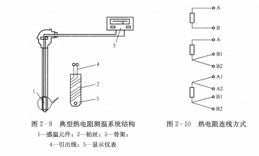 熱電阻測溫系統(tǒng)一般由熱電阻、連接導(dǎo)線和顯示儀表等組成,如圖2-9所示。熱電阻是通過其阻值隨溫度變化來測量溫度的,因此,熱電阻體的引出線等各種導(dǎo)線電阻的變化會(huì)給溫度測量帶來影響。為消除導(dǎo)線電阻的影響一般采用三線制或四線制的連線方式,而不是采用簡單的兩線制連接方式,如圖2-10所示。