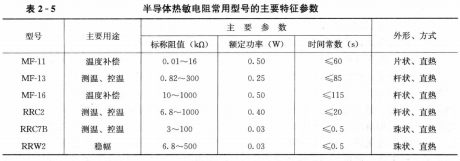 半導(dǎo)體熱敏電阻的種類和型號很多。除了測溫外,正溫度系數(shù)熱敏電阻PTC具有響應(yīng)時(shí)間短,使用壽命長的優(yōu)點(diǎn),使用時(shí)只發(fā)熱,不發(fā)紅,無明火,不易燃燒,常用作恒溫、調(diào)溫和控溫傳感器;臨界溫度系數(shù)熱敏電阻CTR則是一種具有開關(guān)特性的負(fù)溫度系數(shù)熱敏電阻,它是釩、鋇、鍶、磷等元素氧化物的混合燒結(jié)體,是一種半玻璃狀的半導(dǎo)體,也稱為玻璃態(tài)熱敏電阻。表2-5給出了半導(dǎo)體熱敏電阻常用型號的主要特征參數(shù)。
