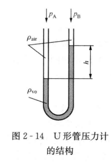 U形管壓力計的結(jié)構(gòu)如圖2-14所示。U形管的兩個端頭,就是直接能感受壓力的傳感部位。U形管一般用直徑為10mm的玻璃管,在U形管中裝有已知密度的液體,一般為水、水銀或四氯化碳等。設(shè)工作液為水,密度為Pwo,U形管壓力計的一支管與大氣相通,壓力為pB,另一支管通人被測壓力pA,則其壓差A(yù)p可寫成