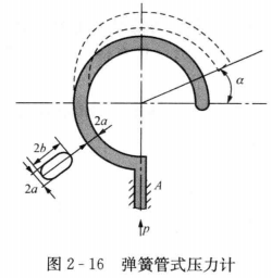 (1)彈簧管式壓力計。彈簧管式壓力計屬于最普遍應(yīng)用的一種壓力計,它不僅可以測量100000~1000000000Pa的壓力,還可以測量真空,其結(jié)構(gòu)十分簡單,是一種用扁圓形或橢圓形截面的管彎成圓弧狀,一端固定,一端自由,而自由端是封閉的,見圖2-16。