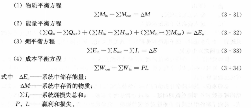 當(dāng)系統(tǒng)穩(wěn)定流動(dòng)時(shí),△M和△E均為零。以上的描述中M代表物流,W代表現(xiàn)金流,Q代表熱量交換的數(shù)量.H代表能量流的焓值。下標(biāo)out和in分別表示流出和流人各個(gè)子系統(tǒng)的流。