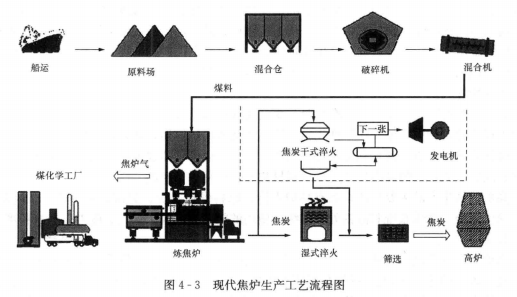 (3)焦化工藝。焦炭是高爐冶煉的主要燃料,也可用于鑄造、有色金屬冶煉、制造水煤氣。焦炭在高爐內(nèi)除了作燃料外,還起還原性和骨架的作用。