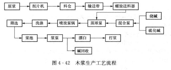 木漿的生產(chǎn)工藝流程見圖4-42。其主要耗能設(shè)備是削片機(jī)、螺旋送料器、混合泵、噴放鍋泵、黑液泵、熱水泵、白水泵、真空泵、打漿機(jī)等。