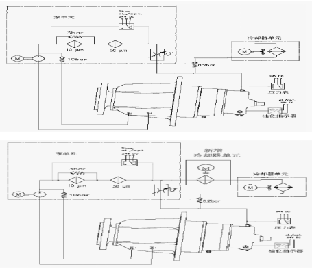 1.改前后齒輪箱冷卻系統(tǒng)原理圖如下: