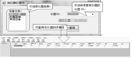 設(shè)備查詢。設(shè)備查詢模塊使得用戶能快速查找指定設(shè)備。指定設(shè)備搜索條件,執(zhí)行查找操作,主界面即可顯示相關(guān)的設(shè)備信息,包括出廠編號、是否在庫、儀器狀態(tài)、使用年限、購買日期等。