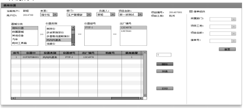 (3)信息共享:公司各專業(yè)的工作人員均可在權(quán)限范圍內(nèi)使用本系統(tǒng),實現(xiàn)了儀器設(shè)備信息共享。用戶可以通過網(wǎng)絡(luò)版系統(tǒng)查詢儀器設(shè)備庫存量,并結(jié)合項目需求,定制借用單,避免遇見設(shè)備庫存空缺的情況。