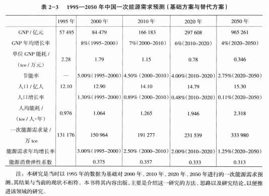 1)根據(jù)中國政府制定的經(jīng)濟(jì)發(fā)展規(guī)劃,設(shè)定1995-2000年GNP年均增長率為8%,2000-2010年為7%。根據(jù)未來我國經(jīng)濟(jì)發(fā)展前景,設(shè)定2010-2020年為6%,2020-2050年為4%。