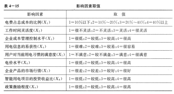 將涉及響應(yīng)行為影響因素的項(xiàng)目提煉成9個(gè)變量,分別為電費(fèi)占總成本的比例X,、工作時(shí)間的靈活度Xz、企業(yè)成本管理控制水平X3、用戶用電信息的易獲性X4、用戶對(duì)當(dāng)前用電習(xí)慣的滿意度X0、電價(jià)水平X6、企業(yè)產(chǎn)品的市場(chǎng)行情X7、智能用電項(xiàng)目的投資收益比X8、政策激勵(lì)程度X11。為便于軟件分析,對(duì)9個(gè)變量進(jìn)行相應(yīng)的量化處理,處理結(jié)果如表4 -15所示。