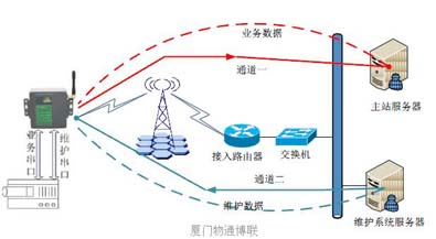 現(xiàn)場采集設(shè)備的業(yè)務(wù)串口與維護(hù)串口分別與無線模塊化的串口一和串口二相連。正常通信的時(shí)候業(yè)務(wù)數(shù)據(jù)只走通道一,實(shí)現(xiàn)配網(wǎng)自動(dòng)化。當(dāng)需要對采集設(shè)備進(jìn)行維護(hù)的時(shí)候維護(hù)系統(tǒng)服務(wù)器與無線模塊建立通道二,實(shí)現(xiàn)遠(yuǎn)程維護(hù)的功能。