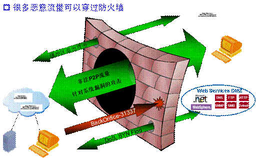 各種蠕蟲、病毒、應(yīng)用層攻擊技術(shù)和EMAIL、移動(dòng)代碼結(jié)合,形成復(fù)合攻擊手段,使威脅更加危險(xiǎn)和難以抵御。這些復(fù)合威脅直接攻擊企業(yè)核心服務(wù)器和應(yīng)用,給企業(yè)帶來了重大損失;對(duì)網(wǎng)絡(luò)基礎(chǔ)設(shè)施進(jìn)行DDOS攻擊,造成基礎(chǔ)設(shè)施的癱瘓;更有甚者,像電驢、BT等P2P應(yīng)用和MSN、QQ等即時(shí)通信軟件的普及,企業(yè)寶貴帶寬資源被業(yè)務(wù)無關(guān)流量浪費(fèi),形成巨大的性能威脅。這些威脅大部分都能夠穿透防火墻,防火墻基于TCP/IP 3層和4層的訪問控制對(duì)這些問題無能為力。