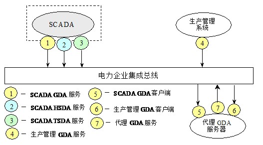 IEC 61970的第402-449部分定義了一個組件能用來與另一個組件交換信息或以標準方式訪問公共數(shù)據(jù)的服務(wù)。這些通用服務(wù)允許使用公共的API訪問CIM信息,其目的為方便使用組件技術(shù)和EAI相關(guān)技術(shù),并充分發(fā)揮CIM的作用。圖2示意給出了集成平臺上生產(chǎn)管理GDA服務(wù)器與SCADA GDA服務(wù)器及代理GDA服務(wù)器三者之間的關(guān)系。