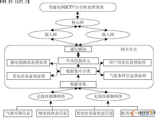 面向智能電網(wǎng)的物聯(lián)網(wǎng)應(yīng)用,其目的首先在于提高電力系統(tǒng)生產(chǎn)環(huán)節(jié)的信息化與自動化程度。這類應(yīng)用的實現(xiàn)主要依托于物聯(lián)網(wǎng)末端的無線傳感器網(wǎng)絡(luò),應(yīng)用場景主要包括高壓輸電線路、變電站一、二次設(shè)備尤其是一次設(shè)備的在線監(jiān)測等應(yīng)用,通過對線路與設(shè)備運行狀態(tài)的連續(xù)感知及趨勢預(yù)測,提高電網(wǎng)的安全水準(zhǔn),降低電網(wǎng)的運行成本;也包括像配電網(wǎng)自動化及用電信息采集等電網(wǎng)需求側(cè)通信的應(yīng)用。由于以上這些應(yīng)用對通信的實時性要求不高,而通信節(jié)點數(shù)量龐大,非常適合采用低成本、低功耗和小型化的無線傳感器網(wǎng)絡(luò)技術(shù)。由大量的傳感器節(jié)點自主形成一個多跳網(wǎng)絡(luò),實現(xiàn)物與物之間的直接通信。節(jié)點的較高密度分布使得監(jiān)測數(shù)據(jù)能夠滿足一定的精度要求。每個傳感器節(jié)點采集的信息數(shù)據(jù)經(jīng)無線傳感器網(wǎng)絡(luò)傳至網(wǎng)關(guān)節(jié)點,由于網(wǎng)關(guān)節(jié)點包含數(shù)據(jù)采集模塊、數(shù)據(jù)處理和控制模塊、通信模塊和供電模塊等,因此可自動進行數(shù)據(jù)的分類,選擇合適的預(yù)處理方式,對視頻信息、氣象信息、線路及設(shè)備的運行狀態(tài)信息進行集中分類和數(shù)據(jù)融合,這樣可以大大減少數(shù)據(jù)通信量,減輕網(wǎng)關(guān)節(jié)點的轉(zhuǎn)發(fā)負(fù)擔(dān),減少節(jié)點能量消耗。但由于網(wǎng)關(guān)節(jié)點的處理能力有限,它所采集的數(shù)據(jù)在傳感器網(wǎng)絡(luò)內(nèi)只能進行粗粒度的處理,因此信息數(shù)據(jù)必須傳至智能電網(wǎng)ICT 分析處理平臺進行細(xì)粒度的處理分析,根據(jù)處理情況發(fā)送命令,做到故障的及時發(fā)現(xiàn)和解決。